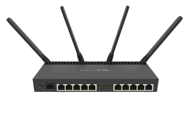 Le RB4011iGS+5HacQ2HnD-IN (modèle Wi-Fi) est un module bi-bande à quatre canaux prenant en charge un débit de données allant jusqu’à 1 733 Mbits/s en 5 GHz. Pour les appareils plus anciens, il est également équipé d’une carte sans fil 2 GHz à double canal installée dans un emplacement miniPCI-e.